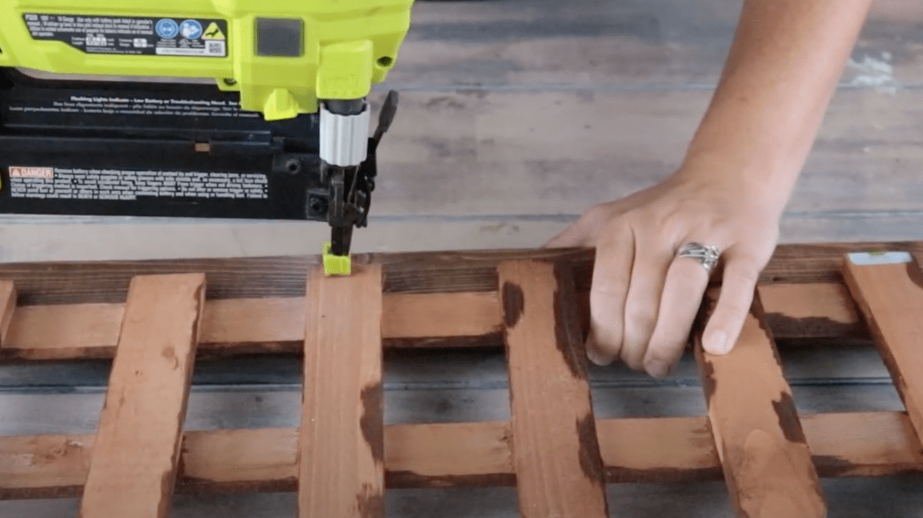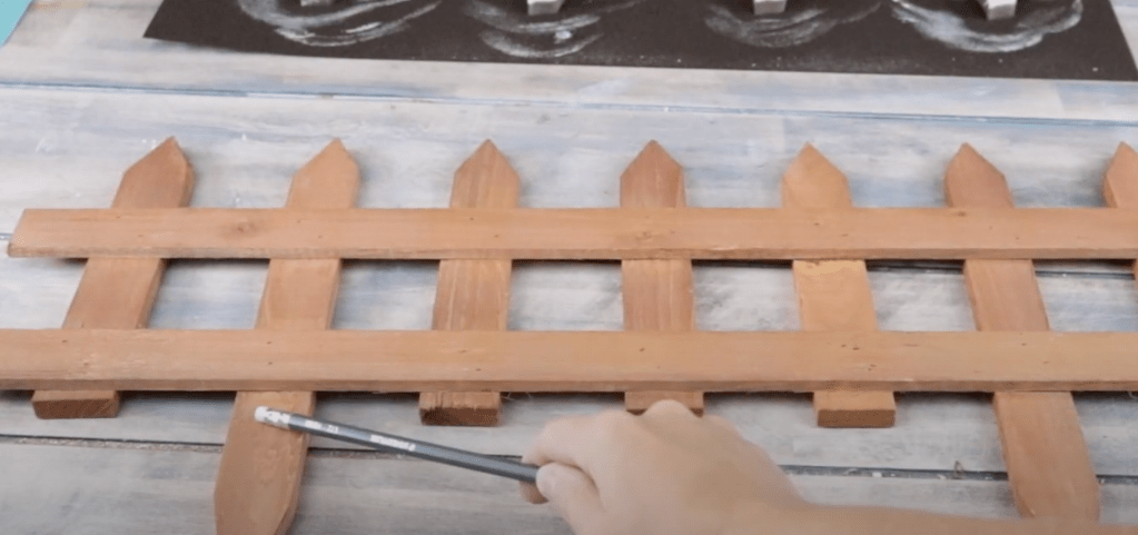 Once both pieces were dry, I used an air nailer to secure the fence to the 1×2. The fence sit nicely on the 1×2 as I used bottom horizontal rung to sit on the 1×2.