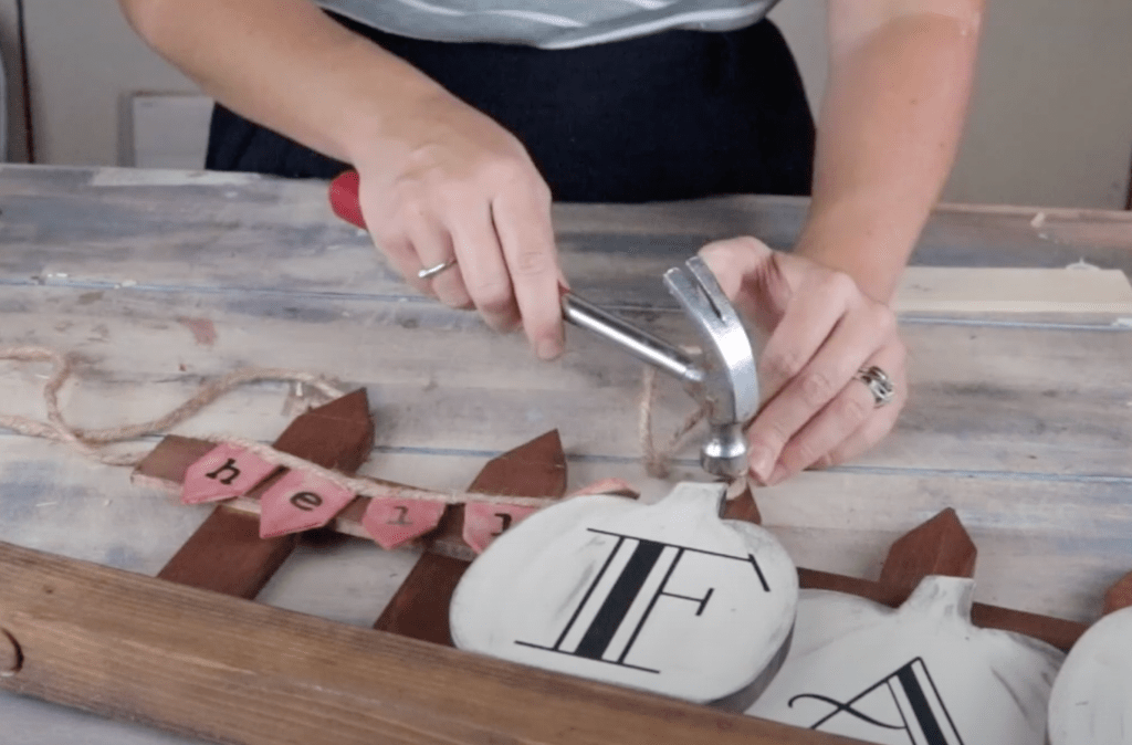 I decided that the jute twine needed just a little something so I hammered in a couple rustic finish nails to make it look like they were holding the banner in place — but really it’s hot glued…shhhh 😉