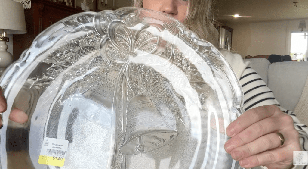 One of my first stops was the Mission Thrift Store, where I stumbled upon a beautiful glass serving tray adorned with classic Christmas bells. As soon as I laid eyes on it, I was instantly transported back to my childhood, remembering how my mom and grandparents would display similar platters during the holiday season.