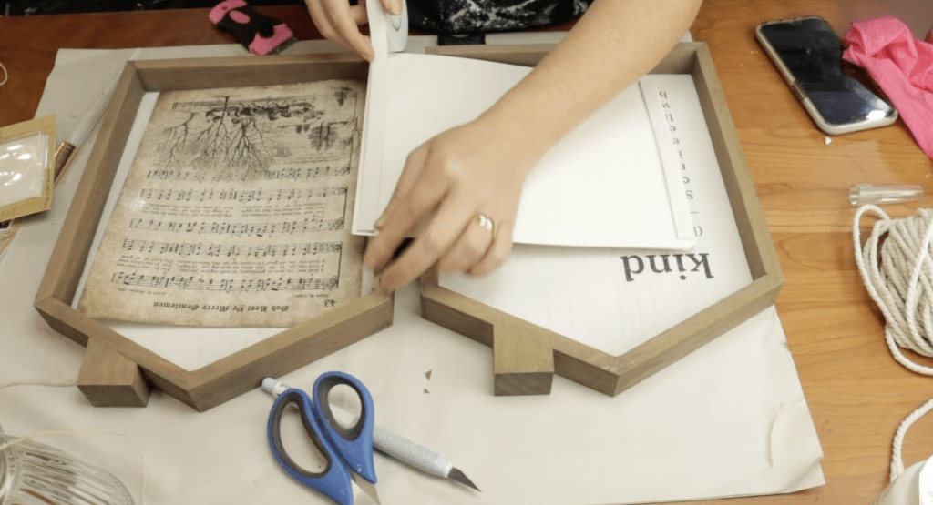 To begin, I carefully removed the fine glitter that was already on the houses, ensuring a clean surface for my DIY. I then cut down some sheet music pages to fit inside the houses, using 3D foam tape to give them a bit of dimension and depth.