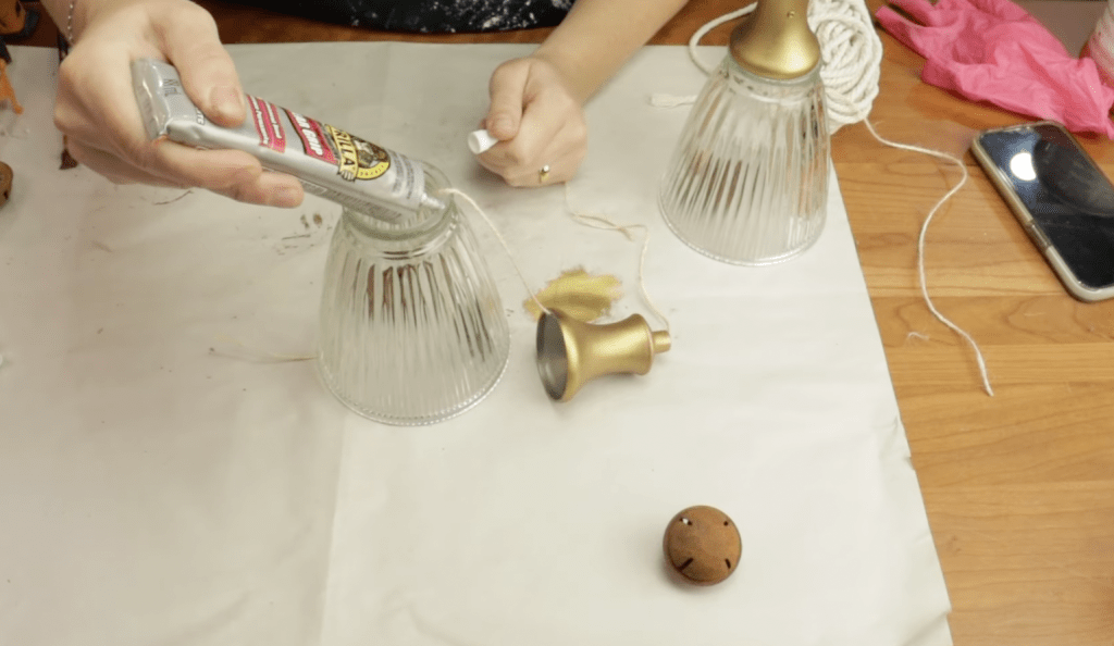 To bring these lamp shade ornaments to life, I first removed the ends of the toilet paper holder I had also thrifted, giving me the perfect topper for the lamp shades. I then used Gorilla Glue to attach the toilet paper holder ends to the lamp shades, securing them in place with a bit of hot glue as well.